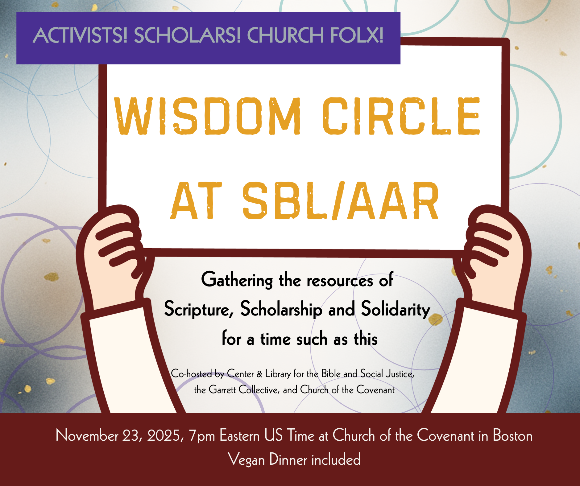 The Garrett Collective and the Center and Library for the Bible and Social Justice (CLBSJ) in collaboration with the Church of the Covenant invite all justice-oriented scholars attending the SBL/AAR Conference in Boston, and all Boston-area activists and faith leaders, to come together for a “Wisdom Circle.” A potluck-style vegan dinner will be served!